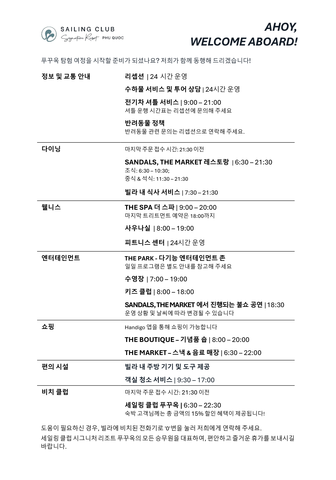 ➡ 스파 트리트먼트 20% 할인 / 리조트 F & B 레스토랑 (Sandals, Sailing Club Phu Quoc) 단품 메뉴 15% 할인.
